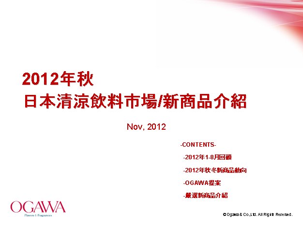Japan's new product files have been uploaded to the download area, if you need any services, please contact us... 2012年1-8月回顧 -2012年秋冬新商品動向 -OGAWA提案 -嚴選新商品介紹...