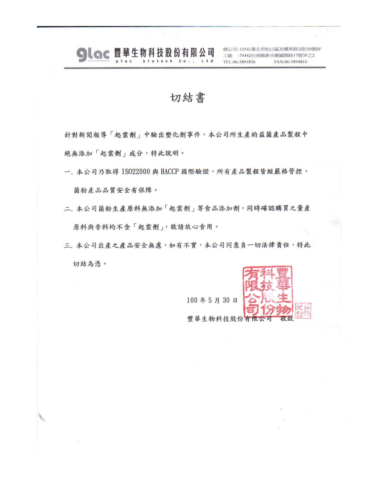 é‡å°é£Ÿå“æ·»åŠ ç‰©ä¸ã€Œèµ·é›²åŠ‘ã€é©—å‡ºå«æœ‰å¡‘化劑事件,本公å¸è²æ˜Žå¦‚下: