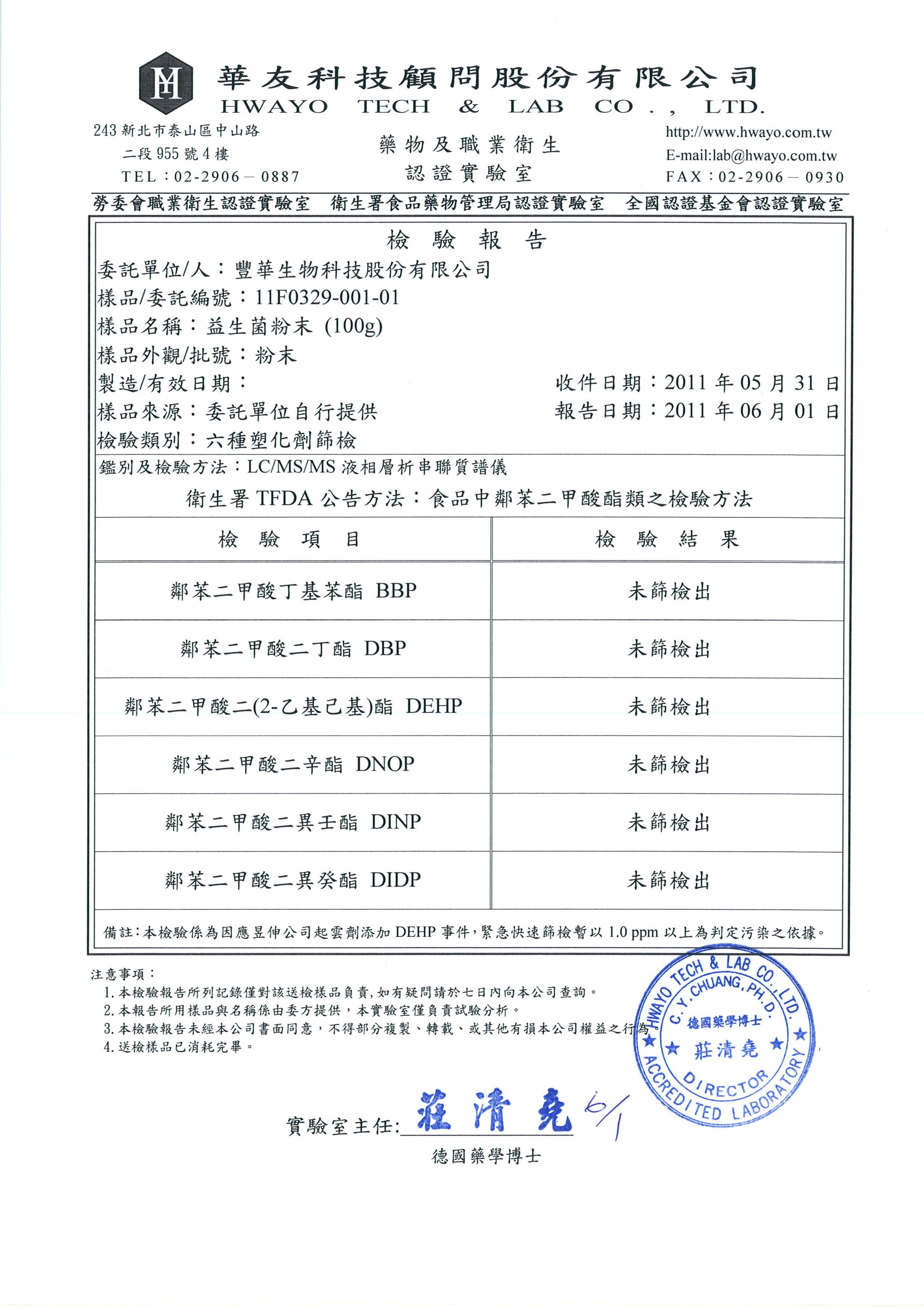 Plasticizer is not approved by the Food Sanitation Law of Taiwan as a food additive. The analysis report showed that there is no Plasticizer in our probiotics powder.