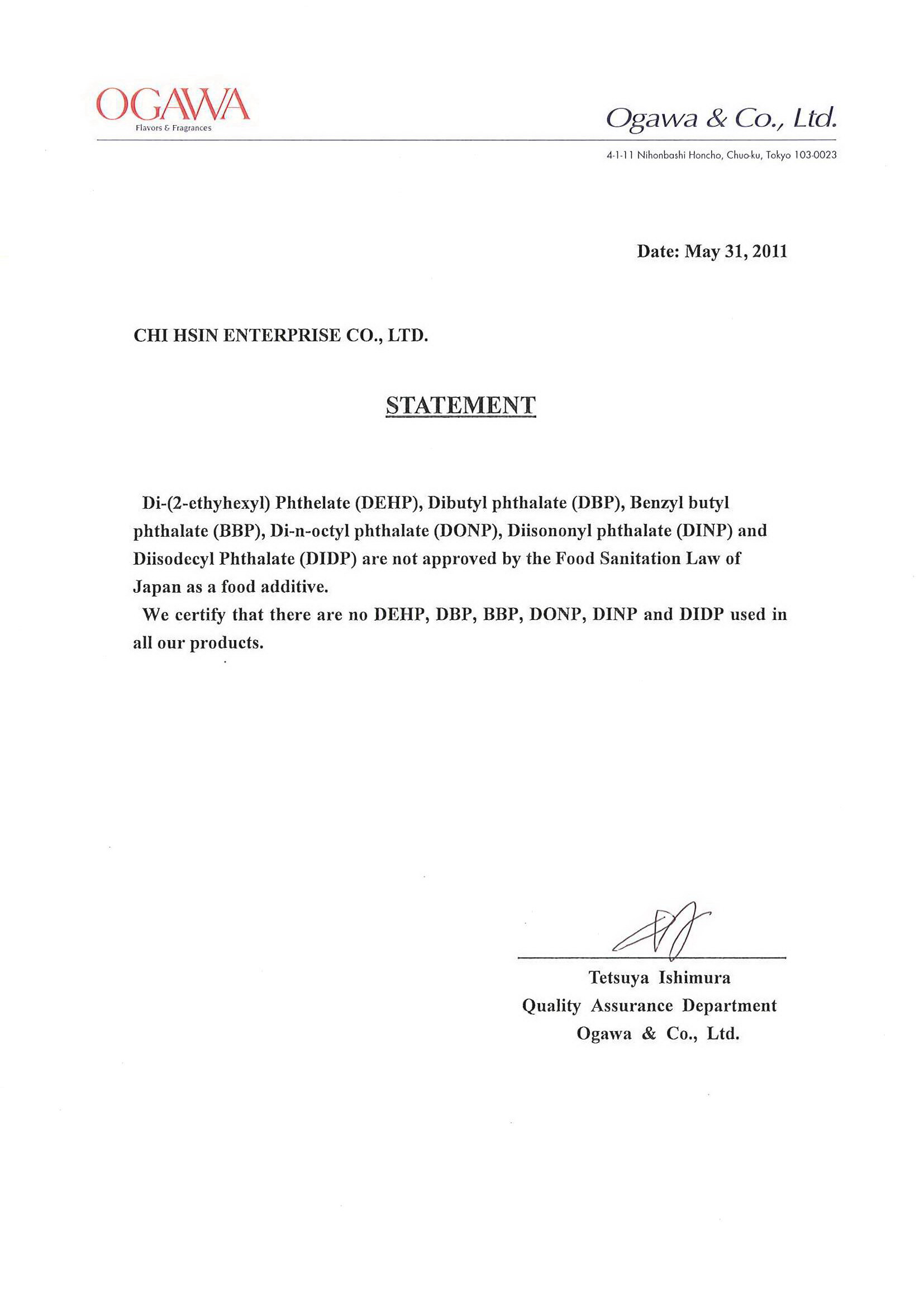 Plasticizer is not approved by the Food Sanitation Law of Japan as a food additive. We certify that there is no Plasticizer used in all our products.